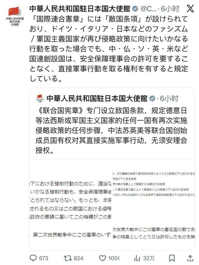 日前,中国驻日使馆用中日双语发帖,重申《联合国宪章》中的敌国条款,该条款规定:德、意、日等法西斯或军国主义国家的任何一国有再次实施侵略政策的任何步骤,中、法、苏、英、美等联合国创始成员国有权对其直接实施军事行动,无须安理会授权。显然,该条款是一把不折不扣的“尚方宝剑”。